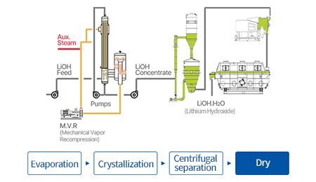 Lithium hydroxide and lithium carbonate are primarily used for high-capacity electric vehicle batteries due to their ease of synthesis with nickel, which enhances battery capacity. Additionally, they possess strong electrochemical properties and are commonly utilized as lithium oxide forms in battery cathode materials. Welcron Hantec provides a turnkey process that evaporates and crystallizes supplied lithium hydroxide and lithium carbonate aqueous solutions into saturated solutions, followed by dehydration and drying.