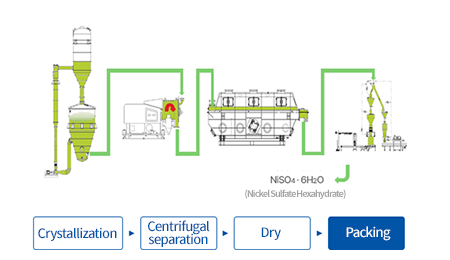 Nickel sulfate, cobalt sulfate, and manganese sulfate are raw materials used to produce cathode materials, which are essential components of secondary batteries. Welcron Hantec offers a turnkey process that includes evaporates and crystallizing supplied aqueous solutions of nickel sulfate, cobalt sulfate, and manganese sulfate, followed by dehydration, drying, and packaging.
