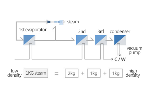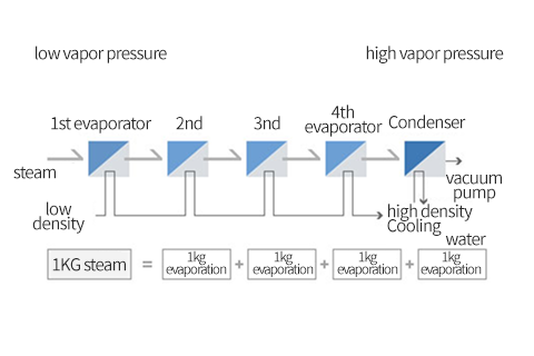A system that sequentially uses vapor generated from one evaporator as the heat source for the next, without relying on compression devices like MVR or TVR.