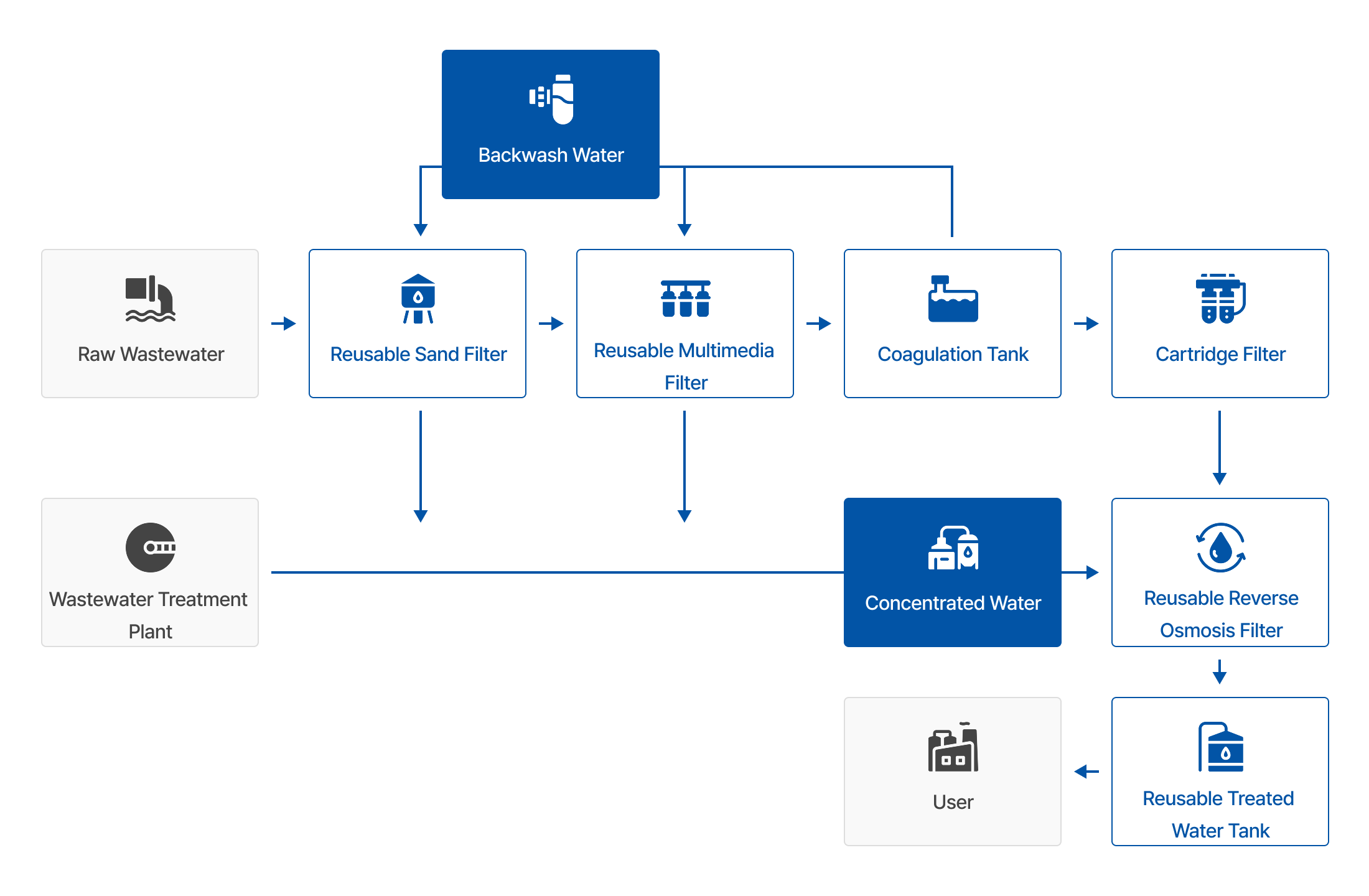 The water treated through the wastewater treatment system can be reused as industrial water, landscape irrigation water, process water, and more after passing through the reuse facilities.